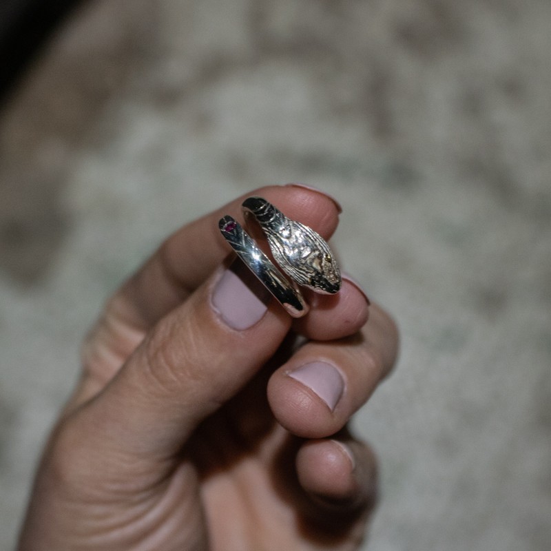 Anello serpente, in argento 935. Serpente ottenuto con la tecnica di fusione in osso di seppia.