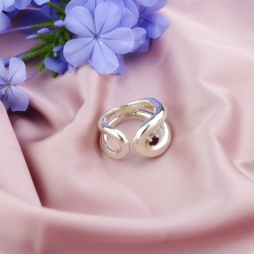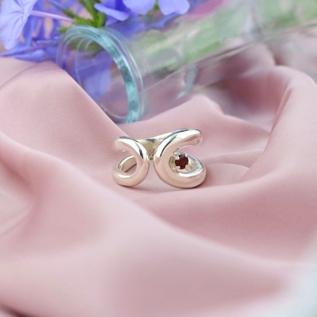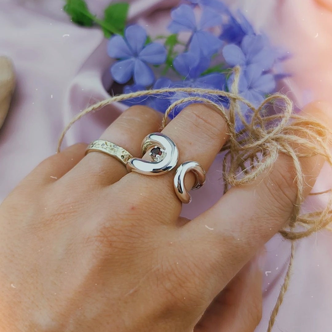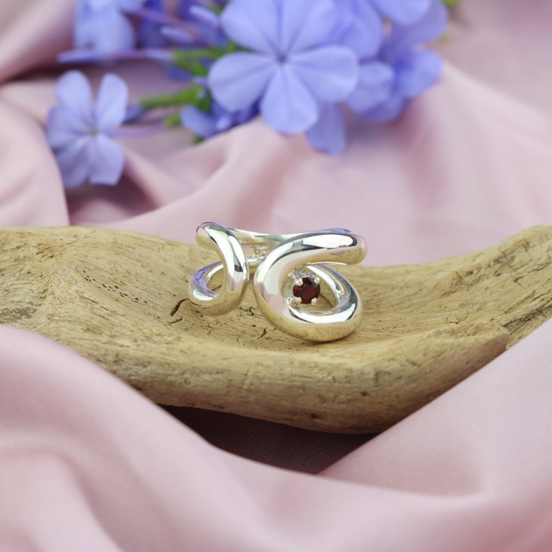 ~Anello Sinuosity~ Un modello semplice e sinuoso dalle linee armoniche e importanti, che accolgono un granato naturale. Dando forma a un autentico gioiello artigianale.