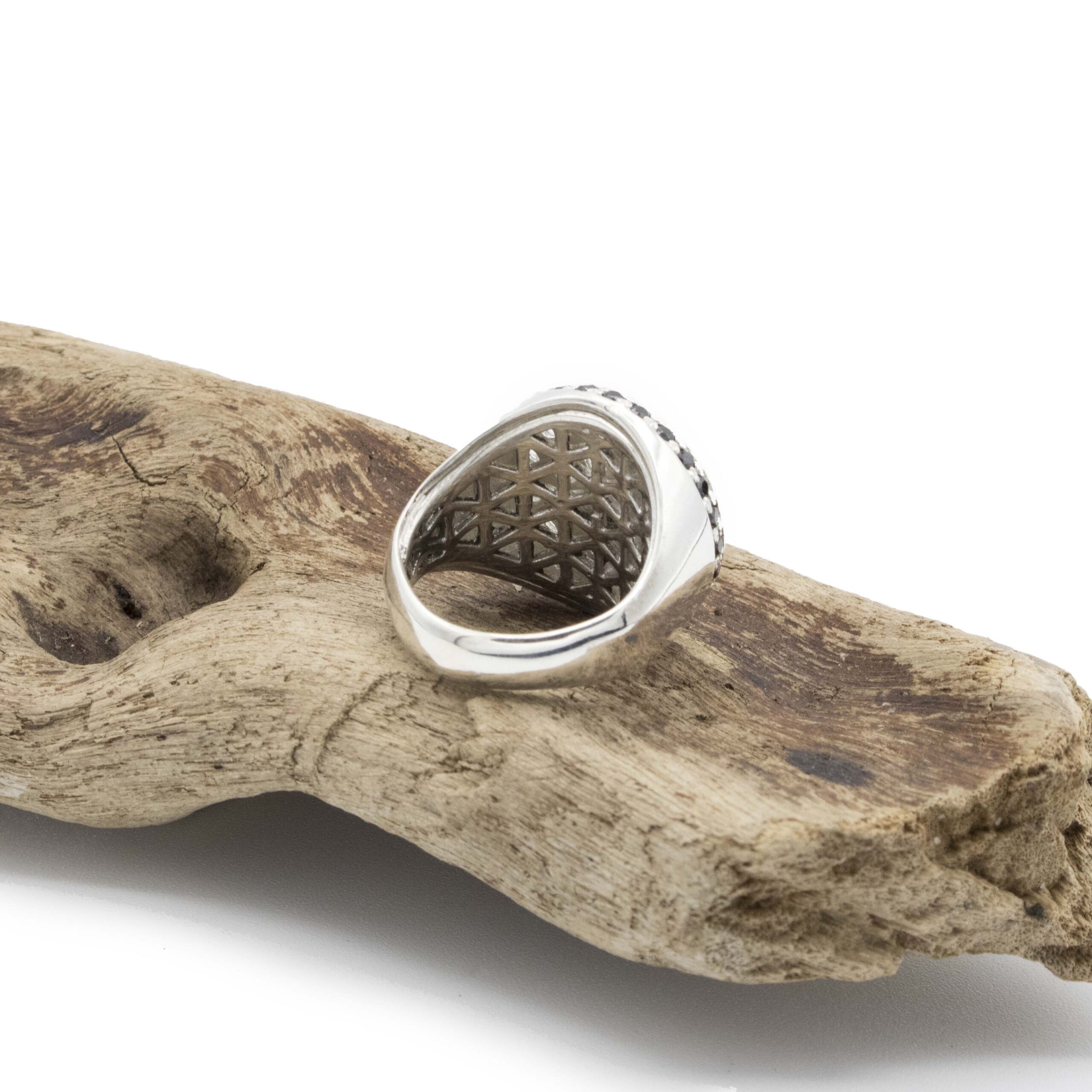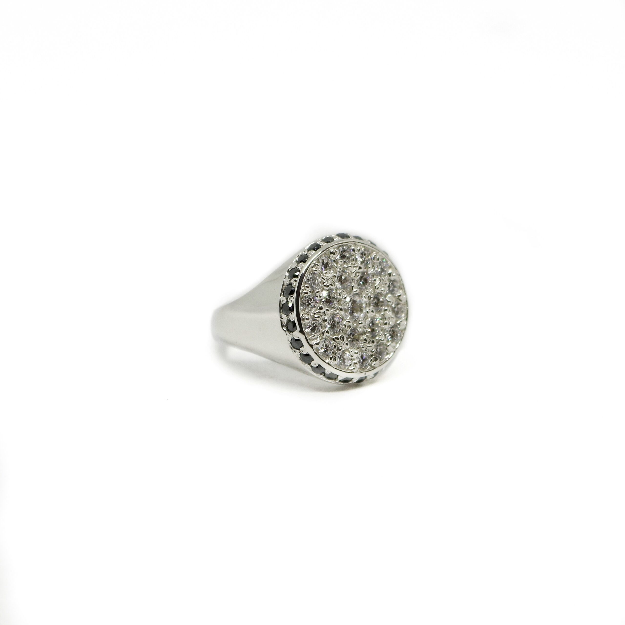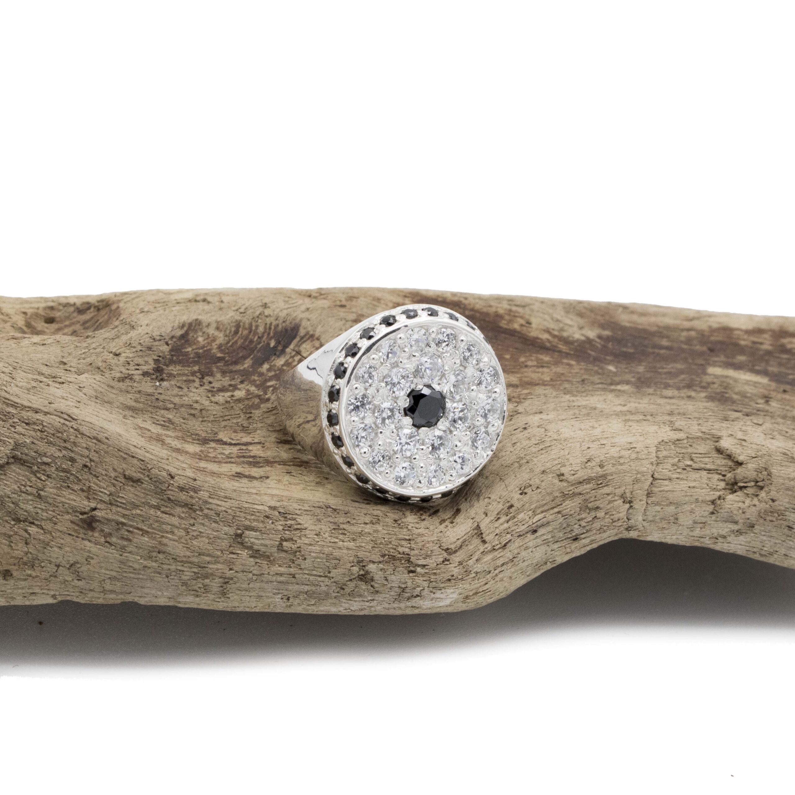 Chevalier tondo da mignolo, in argento935. Con al centro incassatura a pavè di 22 zirconi e giro di 28 zirconi.