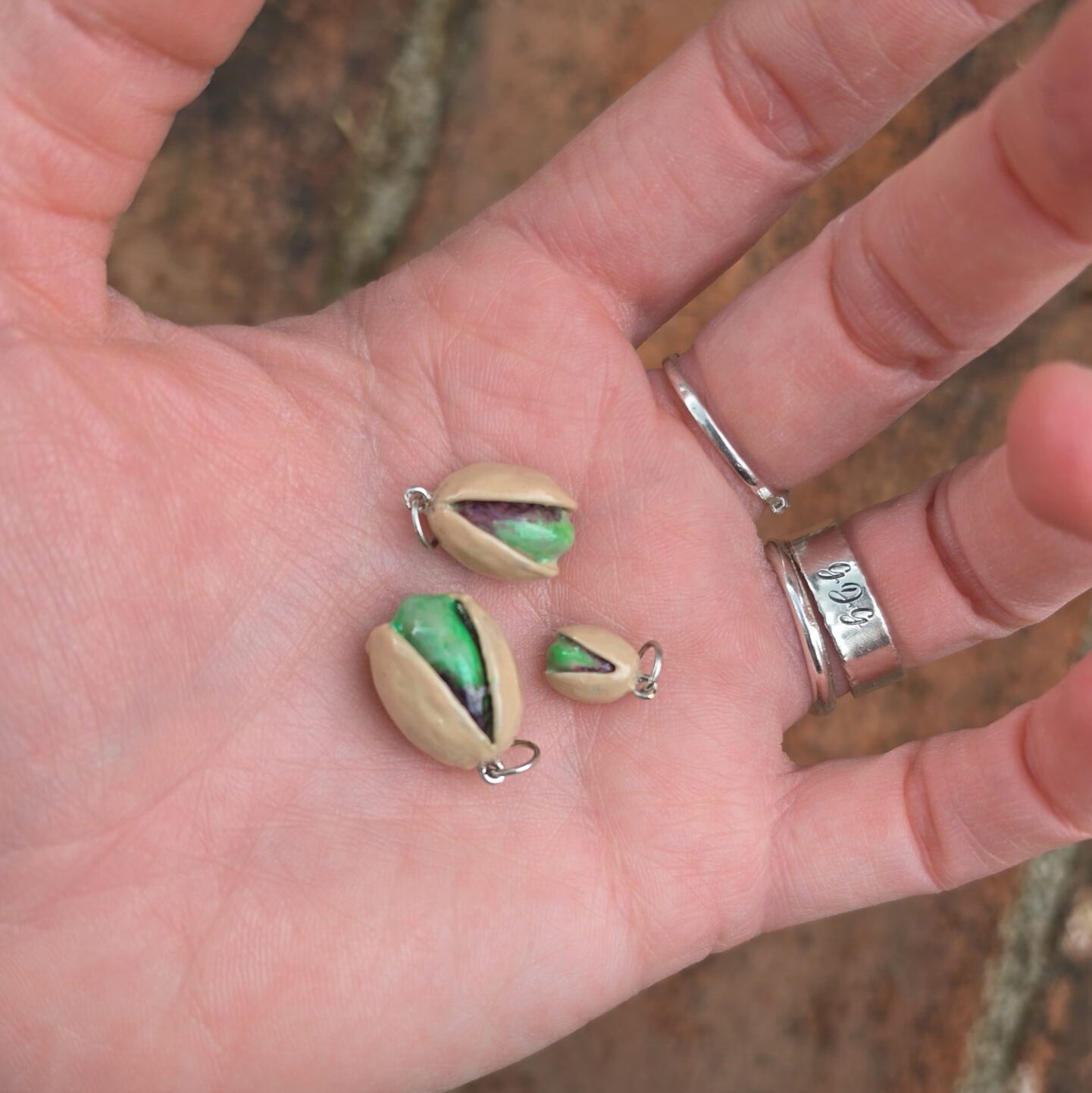 Puoi scegliere la versione brunita lucida (senza colore), perfetta per mettere in risalto i dettagli e i volumi della lavorazione, oppure la versione smaltata, realizzata interamente a mano. Ogni ciondolo pistacchio sarà unico: eventuali leggere variazioni di colore o sfumatura non sono da considerarsi difetti, ma parte del processo artigianale che rende ogni creazione diversa dall’altra.